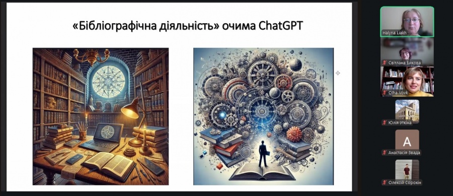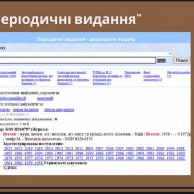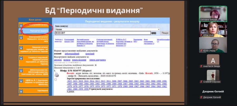 The speakers for the students included the Head of the Department, Yuliia Utkina, the Head of the Library and Bibliographic Services Sector, Svitlana Bykova, and the Head of the Scientific Bibliography Sector, Halyna Liakh. The meeting was dedicated to the issues of library heuristics. Students learned about the traditional and electronic reference resources of the scientific library, the components of the bibliographic fund’s reference and search apparatus, and local history services and projects at the V. G. Korolenko KhSSL.