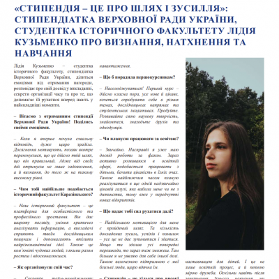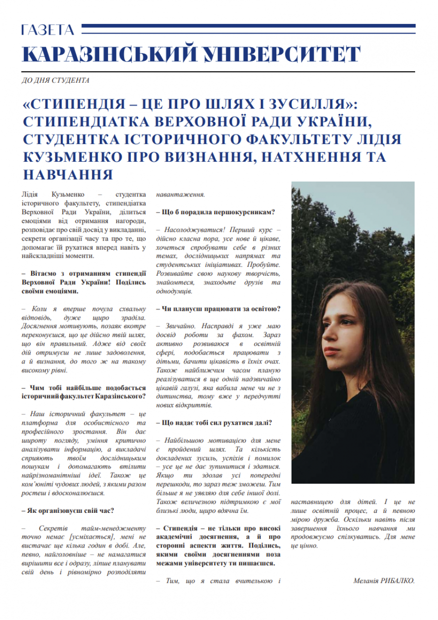In Issue 14 of Karazin University newspaper (17 November 2025), an interview with Lidiia was published, in which she speaks about recognition, inspiration, and her studies at the Faculty of History of V. N. Karazin Kharkiv National University.