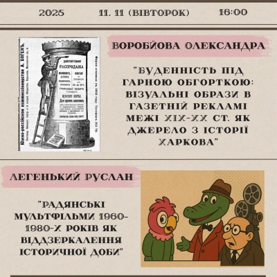 11 листопада відбулося засідання гуртка історіографії, джерелознавства та спеціальних історичних дисциплін, присвячене особливостям аналізу та інформаційному потенціалу візуальних джерел. На засіданні свої доповіді представили студентка першого року магістратури Олександра Воробйова - «Буденність під гарною обгорткою візуальні образи в газетній рекламі межі ХІХ-ХХ ст. як джерело з історії Харкова» та студент 4 курсу Руслан Легенький «Радянські мультфільми 1960-1980-х років як віддзеркалення історичної доби». Після доповідей відбулася дискусія щодо функцій візуальних образів у різних соціокультурних середовищах та методів дослідження цих образів.